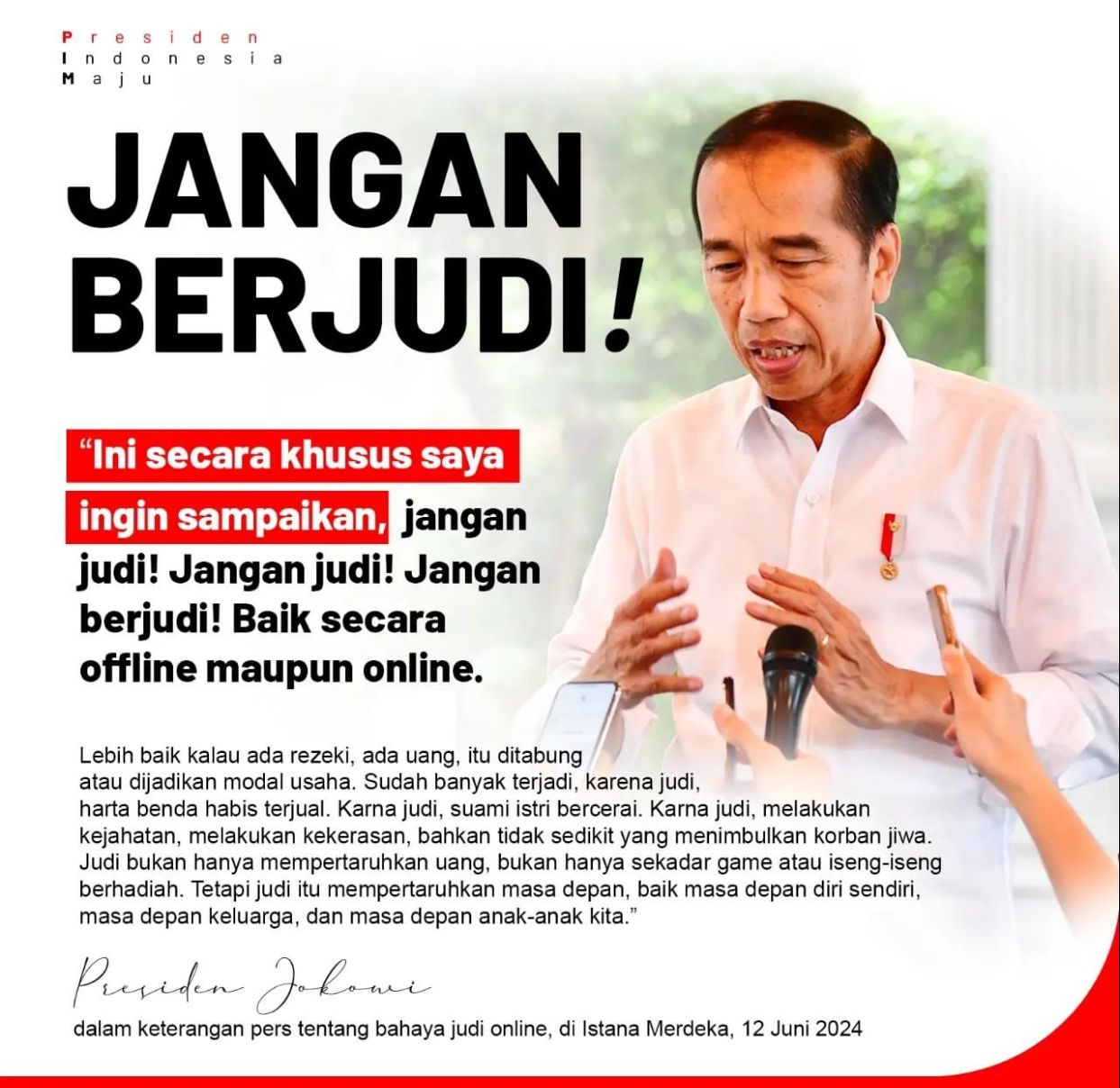 Presiden secara tegas melarang masyarakat terlibat praktek judi dalam bentuk apapun. Hal itu ia sampaikan di Istana Kepresidenan, Rabu (12/6) sore, merespon maraknya kasus perjudian online.
