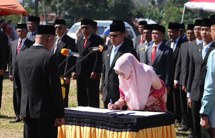 “Pelantikan di lapangan, tempat yang tidak ber AC, dibawah cuaca cukup panas, agar para pejabat yang dilantik paham dan memahami bagaimana kondisi masyarakat yang sebenarnya agar pemerintah mampu memberikan pelayanan yang terbaik kepada mereka,” ungkap Bupati.