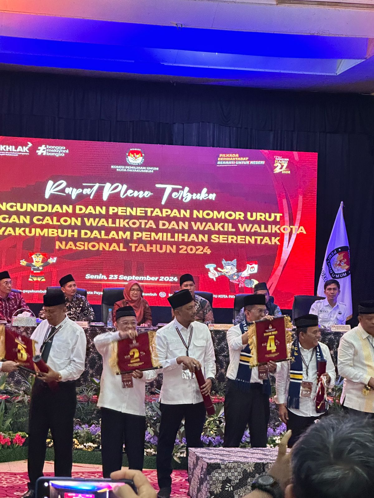 Sumbarheadline– Setelah Penetapan Calon Kepala Daerah, Minggu, 22-9-2024, KPU Kota Payakumbuh lanjutkan dengan Rapat Pleno Sidang Terbuka proses tahapan pengundian penetapan nomor urut pasangan calon kepala daerah Wali Kota/Wakil Wali Kota Payakumbuh dalam pemilihan serentak tahun 2024 yang di selenggarakan di GOR M. Yamin Senin (23-9-2024).