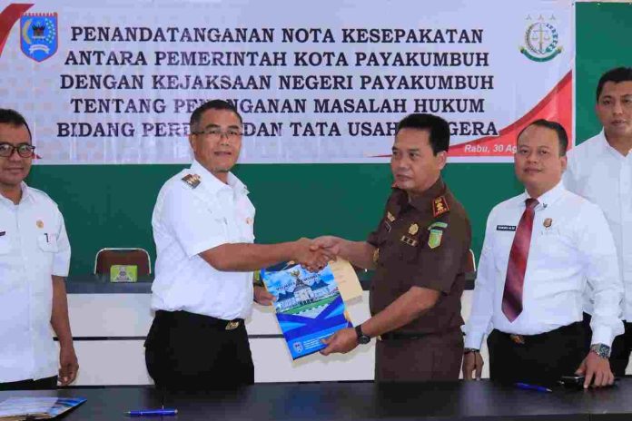 Sumbarheadline-Setiba di Payakumbuh setelah menghadiri dan menerima penghargaan Green Leadership Nirwasita Tantra di Jakarta, Penjabat Wali Kota Payakumbuh Rida Ananda langsung menandatangani nota kesepakatan antara Pemerintah Kota Payakumbuh dengan Kejaksaan Negeri Payakumbuh tentang penanganan masalah hukum bidang perdata dan tata usaha negara di Kantor Kejaksaan Negeri (Kejari) Kota Payakumbuh, Rabu (30/08/23).