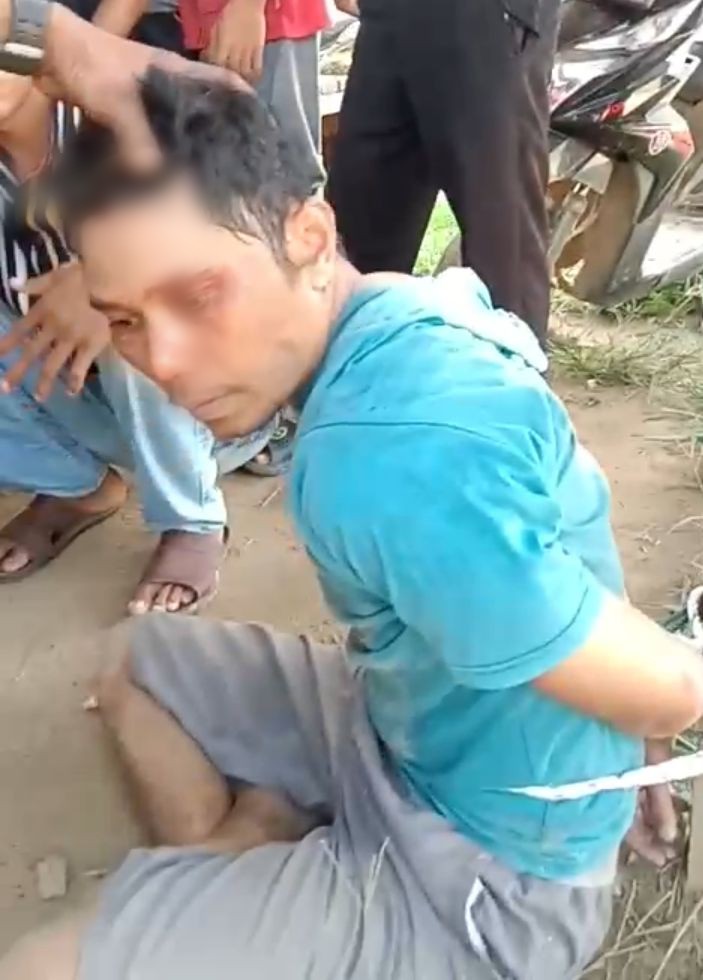 Seperti video yang dikirimkan ke awak redaksi, terlihat seorang pria, memakai baju kaos warna biru, celana pendek warna abu abu, dengan tangan terikat ke tiang, dikelilingi oleh warga Tempatan. Diduga pria yang terikat tersebut merupakan salah satu dari gerombolan rampok yang menghilangkan nyawa seorang pedagang emas keliling pada Jumat 3 Mai 2024 kemaren.