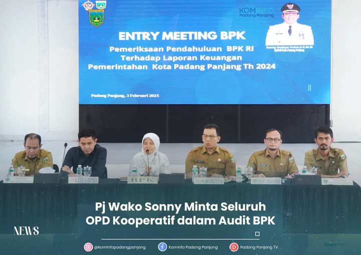 Sumbarheadline– Badan Pemeriksaan Keuangan (BPK) RI Perwakilan Sumatera Barat (Sumbar) bakal melaksanakan audit terhadap keuangan Pemko Padang Panjang selama 27 hari ke depan. Audit ini dimulai dengan entry meeting bersama tim BPK, jajaran pejabat Pemko, Ketua DPRD Imbral, S.E di Hall Lantai III Balai Kota, Senin (3/2/2025).