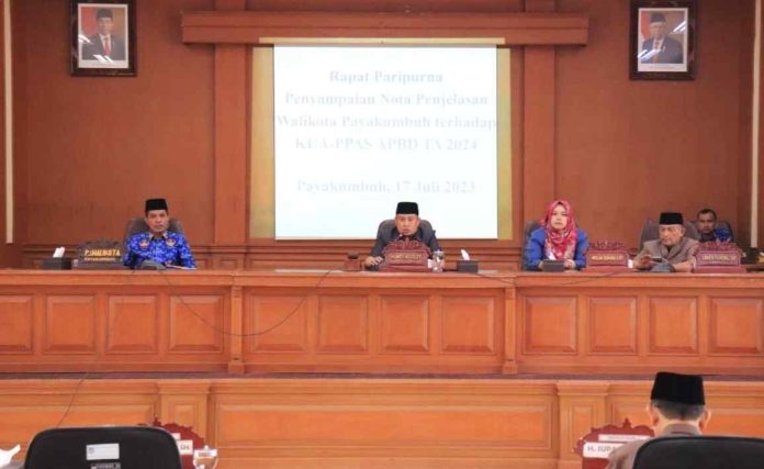 Sumbarheadline-Dalam Rapat Paripurna DPRD Kota Payakumbuh, Wali Kota Payakumbuh menyampaikan Nota Kebijakan Umum Anggaran dan Prioritas Plafon Anggaran Sementara (KUA-PPAS) Kota Payakumbuh Tahun 2024 di Ruang Sidang DPRD, Senin (17/07/23).