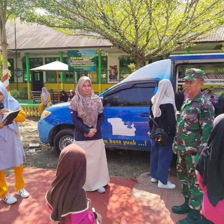 Sumbarheadline-Anggota Satgas TMMD, Lettu Inf Sutikno, menghadiri kegiatan Layanan Literasi Anak melalui perpustakaan keliling di SDN 18 Lagan Gadang Mudik.