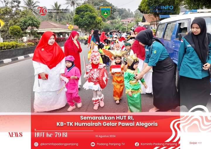 Sumbarheadline– KB dan TK Humairah Kota Padang Panjang meriahkan HUT ke-79 RI dengan menggelar Pawai Alegoris, Jumat (16/8/2024). Pawai ini dilepas Ketua Yayasan Azwar Syarif Mandiri, Drs. Eri Datuak Majo Endah.